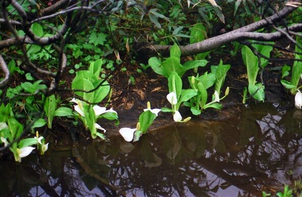 雪溪を渡り切ると湿原に水芭蕉の群落が現れる、巨大化した花ではなくしとやかなサイズ、