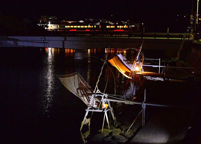 十数年前に見た幻想的な夜間の漁をイメージ、実際は無人の四手網と列車の写真に落ち、