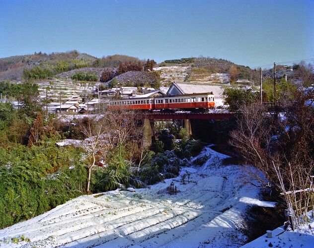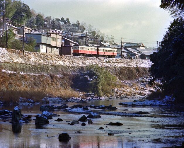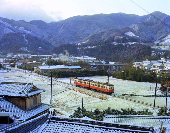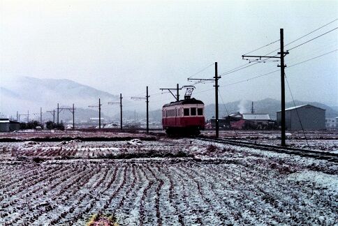 👇下佐々~龍光寺前 モハ24 雪が解け始めた頃生石山の姿をとらえる