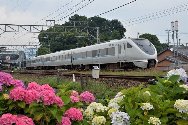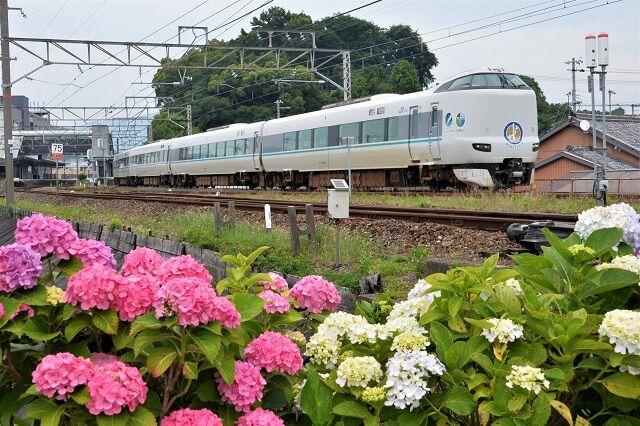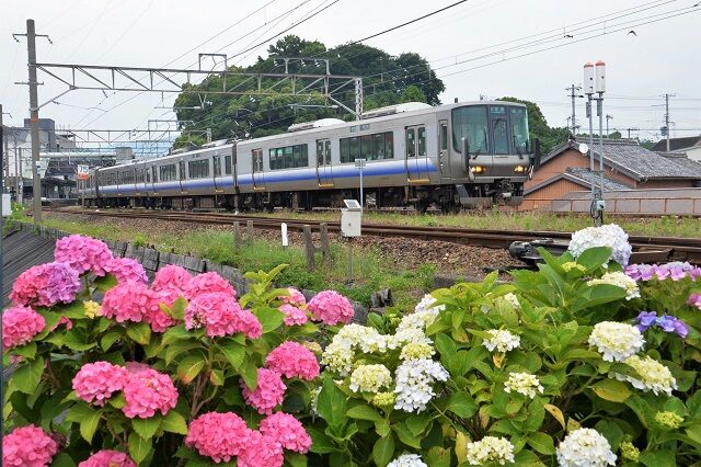 駅構内のアジサイと列車をホームで狙うが、なんとも中途半端な写真になってしまった。
