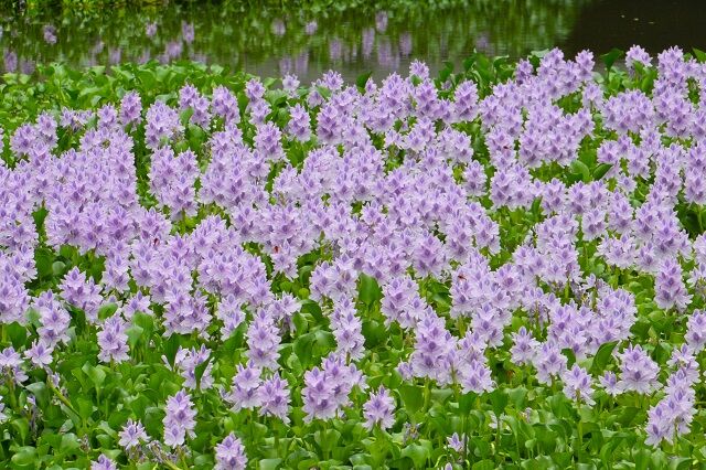 昨年の池の状況と比べてみても今年は生育が良いようだ、池一面にホテイアオイが覆い、