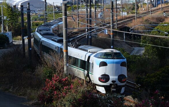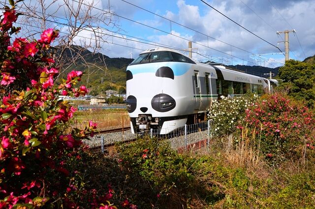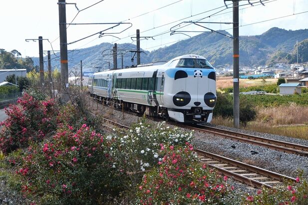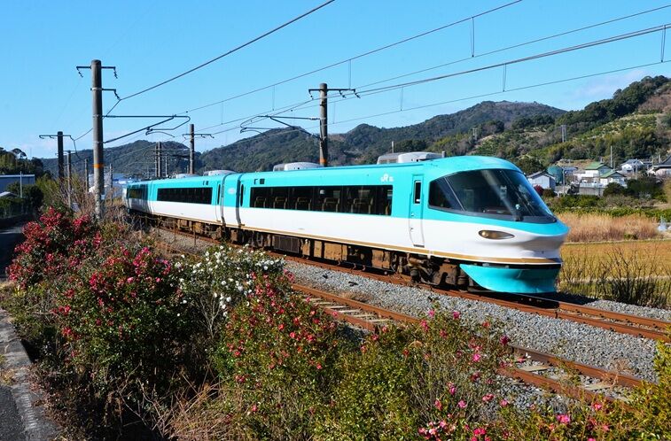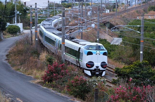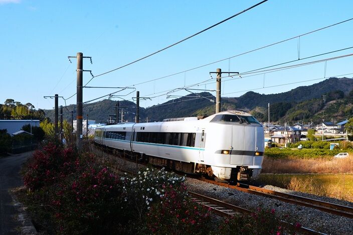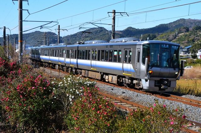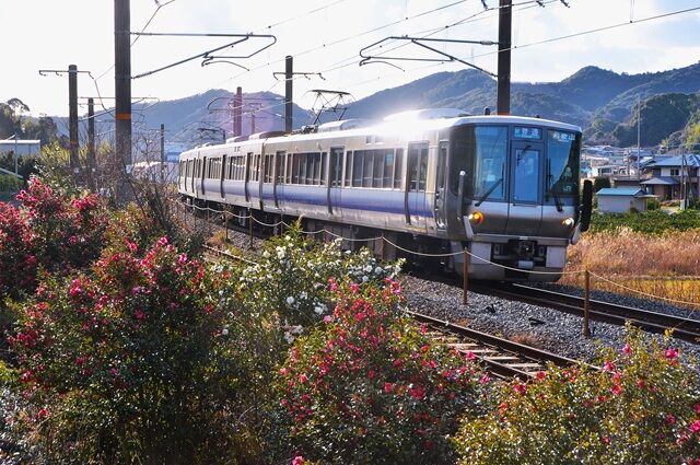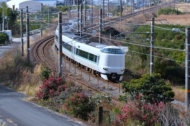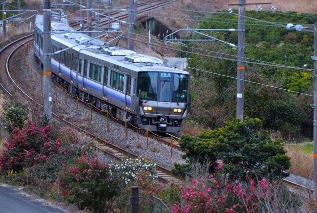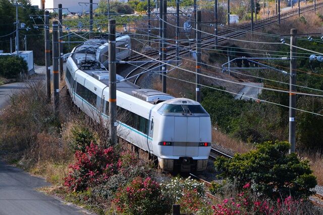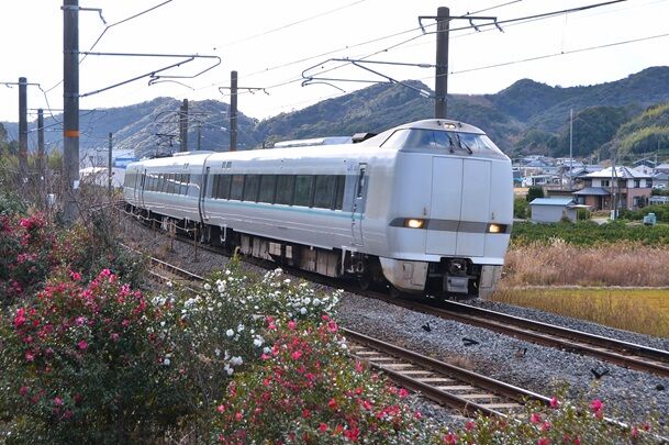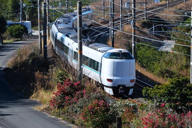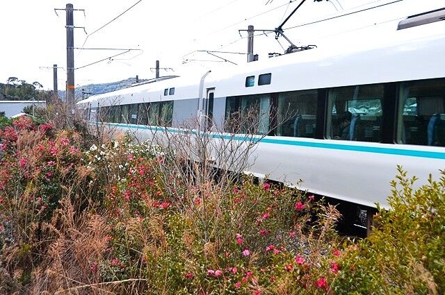R400のカーブの外側の上り線が良いのだが、山茶花の木の間の後追い撮影になってしまう。