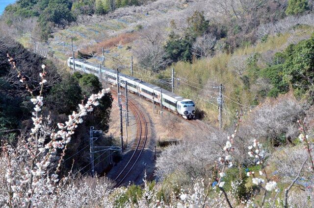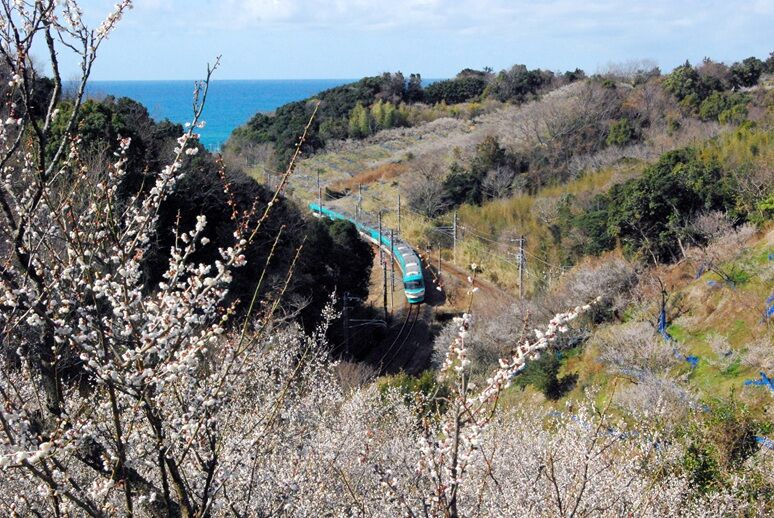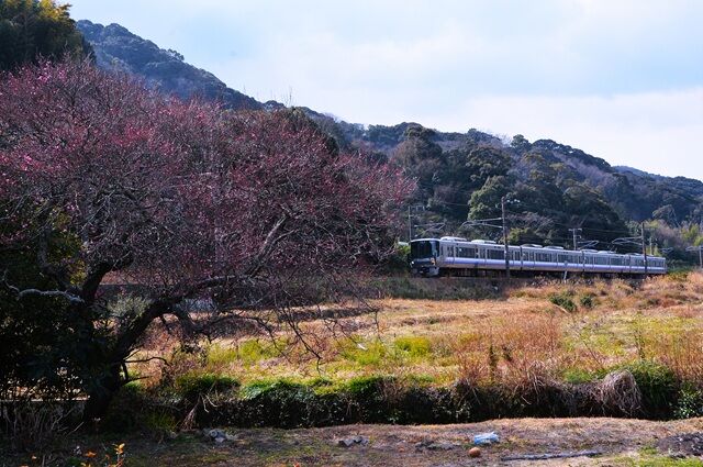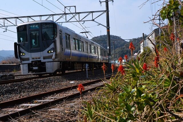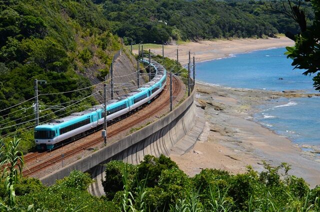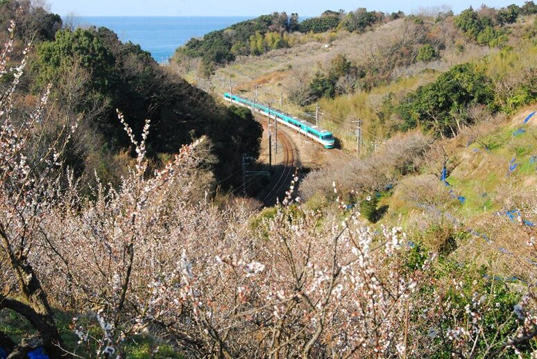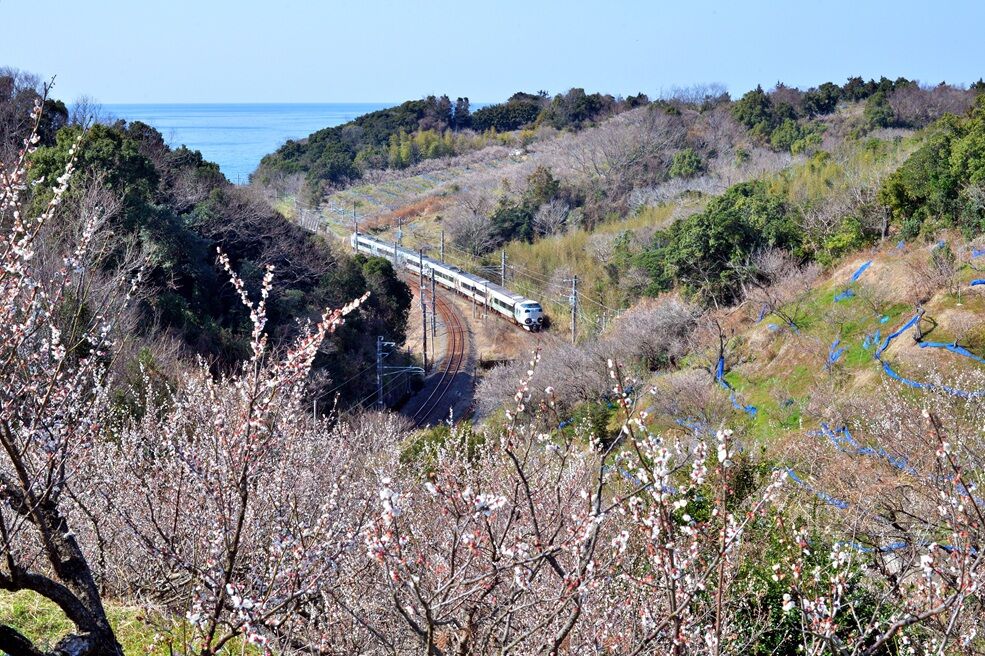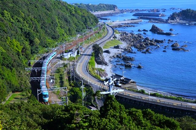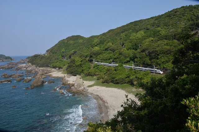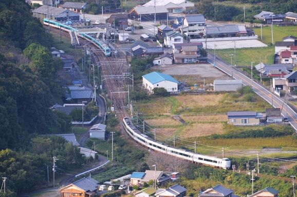 見老津駅付近も複雑に線路が海岸が交わり、山が迫っているので俯瞰撮影が楽しめる、
