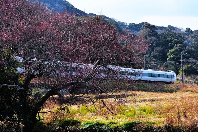 👇周参見~紀伊日置(日置川橋梁) 66M (水道タンク横のウバメガシの木越し)