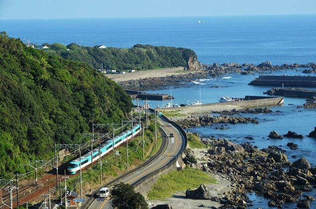 陸の黒島と恋人岬をバックに雄大な海岸線、架線柱の処理に困るが午前中に訪れたい。