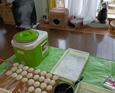 それでも5時間を要して付き終えた。我が家に来て10ケ月の保護猫には初めての餅つき、