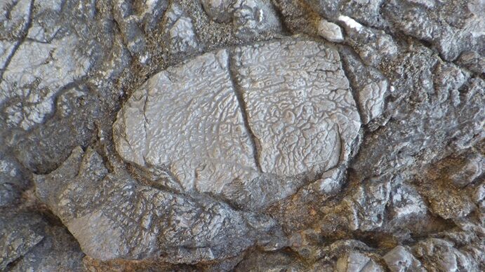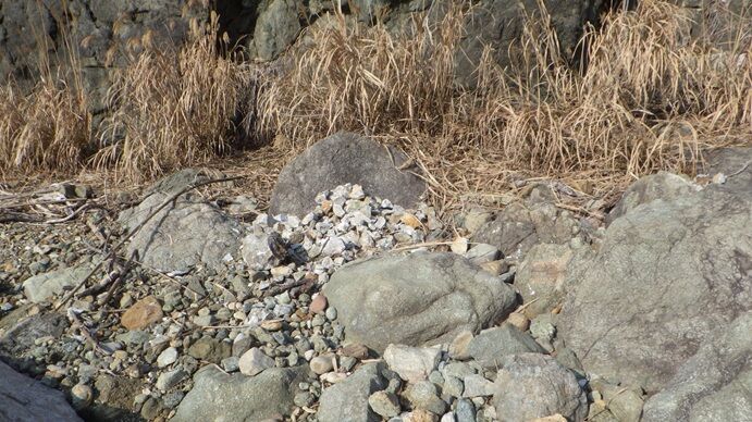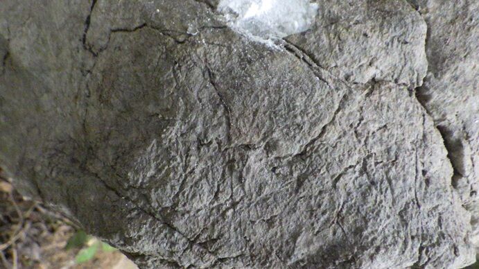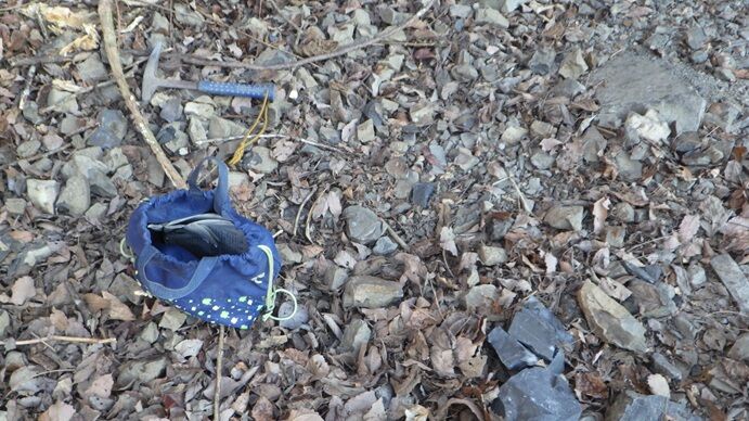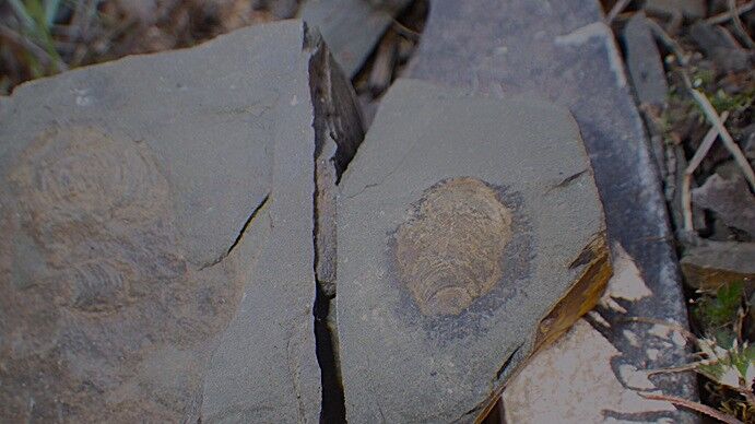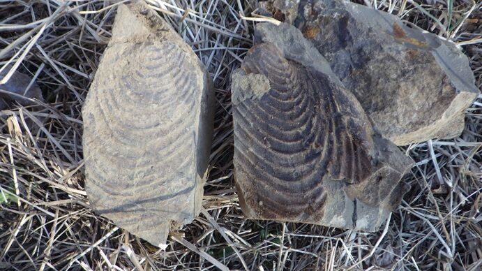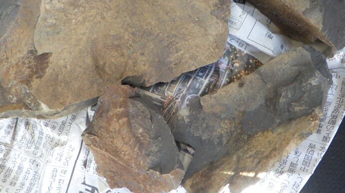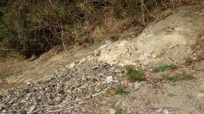 大割し放置された石をしらみつぶしに観察、不完全ながら三角貝が多く見つかりました。