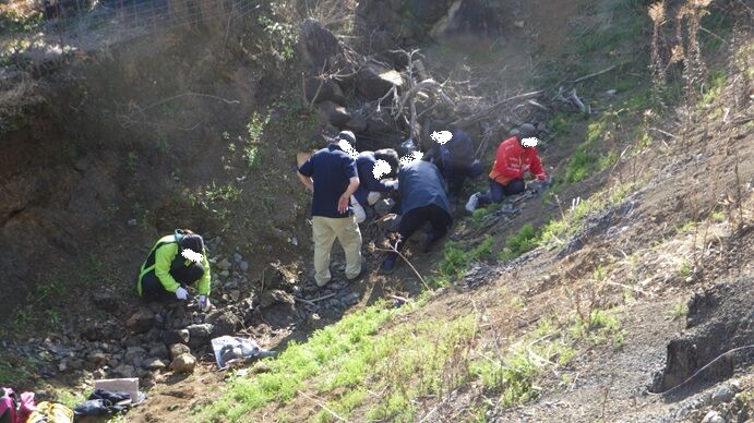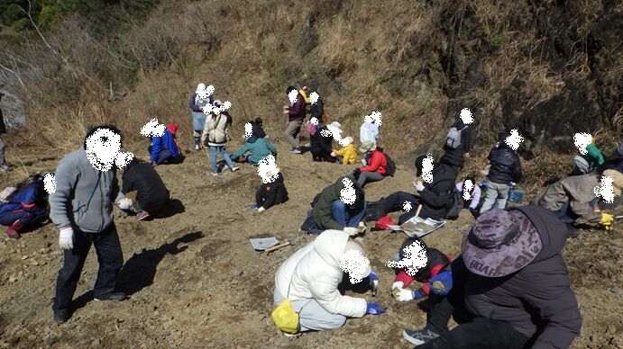 採集前の地層の説明が行われた後に現場に移動、例の場所でカンコンが始まりました、